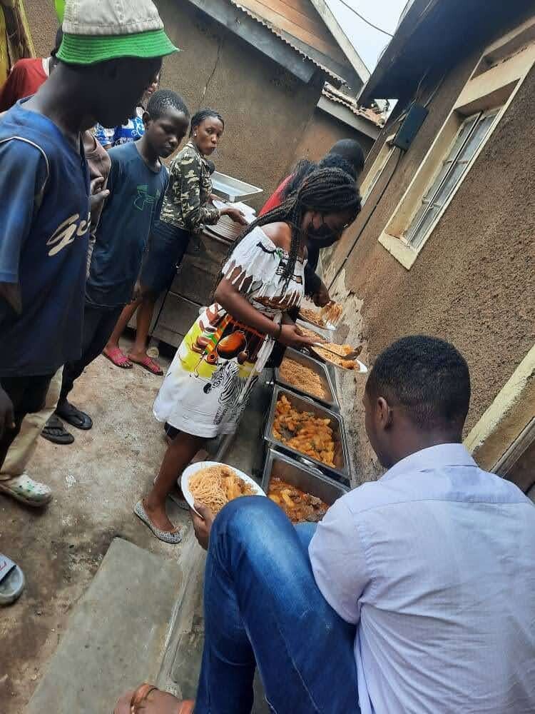 Toen het 14.30 uur was, gingen we lunchen. Dit werd geserveerd door ons team van 5 personen en de kinderen werden allemaal bediend met volle grote borden met eten (rijst, spaghetti, Iers en vlees). Dit is een soort maaltijd die wordt gegeten door de rijke mensen in Oeganda, dus als deze kinderen het krijgen, is het echt een wonder. Ze eten en bewaren zelfs wat in de plastic zakken voor het avondeten.